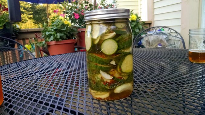 So for a fraction of the price of a jar of pickles, I picked up a large bunch of fresh dill and a couple of english cucumbers. I kind of winged the recipe based on the Vlasic label combined with the typical procedure for making refrigerator pickles. I made a few tweaks to put my own spin on these pickles. My most notable tweak was omitting the mysterious ingredient “Yellow Number 5!” A very healthy move I think – who wants creepy numbered colors in their food?